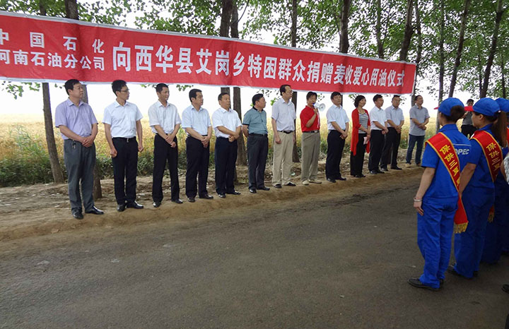 這次捐贈活動為西華縣艾崗鄉(xiāng)半截樓村群眾免費送來了10噸柴油,平均每臺收割機50升。這也是省委宣傳部聯(lián)合中石化河南石油分公司連續(xù)5年開展這項活動。5年來,為駐村群眾免費送油共計50噸。在活動現(xiàn)場,中石化的加油車為十幾臺收割機免費加了“愛心油”,并送給村民每人一個裝有汗衫、毛巾和手套的“愛心禮包”,有效地解決了困難群眾最關(guān)心、最急需的麥?zhǔn)沼糜蛦栴},服務(wù)群眾、支援三夏走完最后一公里。三夏志愿服務(wù)隊員莊嚴(yán)承諾,為顆粒歸倉、豐產(chǎn)豐收提供最便利、最高效的服務(wù)。劉國明副巡視員在致辭詞中轉(zhuǎn)達了部領(lǐng)導(dǎo)對駐村幫扶點半截樓村群眾的問候,對中石化河南石油分公司履行國企職責(zé),積極開展“石油惠農(nóng)服務(wù)優(yōu),支援三夏促豐收”扶貧濟困的愛心行動表示贊賞和感謝。劉國明副視員要求駐村工作隊,三夏期間繼續(xù)加大幫扶力度,對因病致貧、致寡家庭、軍烈屬、外出務(wù)工農(nóng)戶,組織青年志愿者無償幫扶收麥。呼吁社會各界樹立公益愛心理念,傳遞社會正能量,積極開展城市反哺農(nóng)村,企業(yè)支持農(nóng)業(yè),市民關(guān)愛農(nóng)民等活動,為早日建成美麗鄉(xiāng)村助一臂之力。(駐村工作隊)