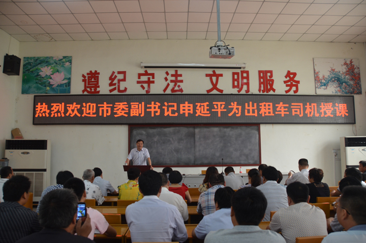 6月10日,濮陽(yáng)市委副書記申延平到濮陽(yáng)市出租車司機(jī)文明學(xué)校為200名出租車司機(jī)志愿者上課培訓(xùn)