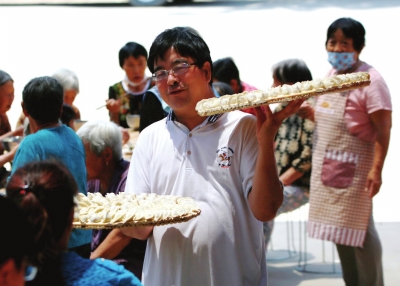 “孝道大餐”現(xiàn)場,史世江和黨員義工一起為老人們端餃子